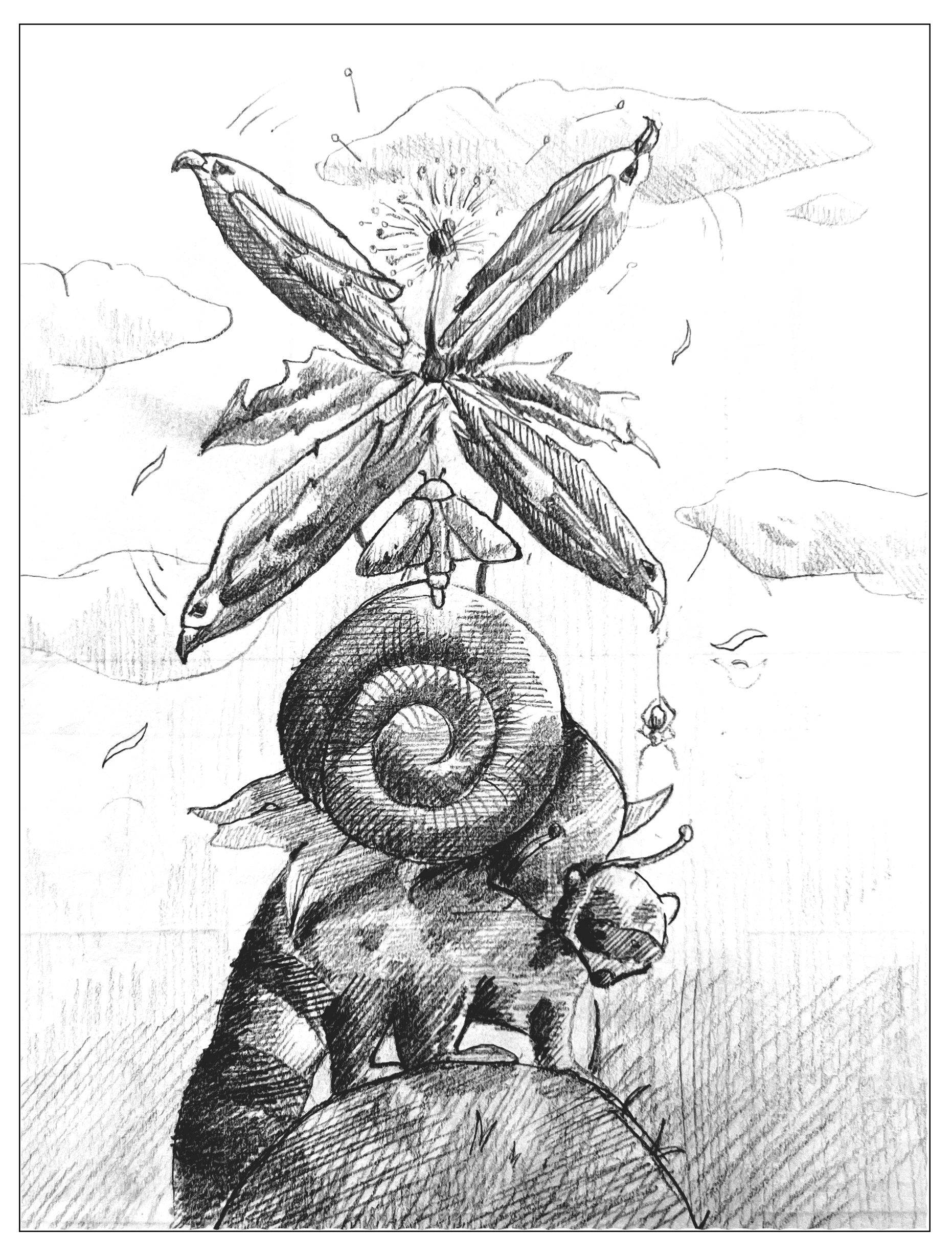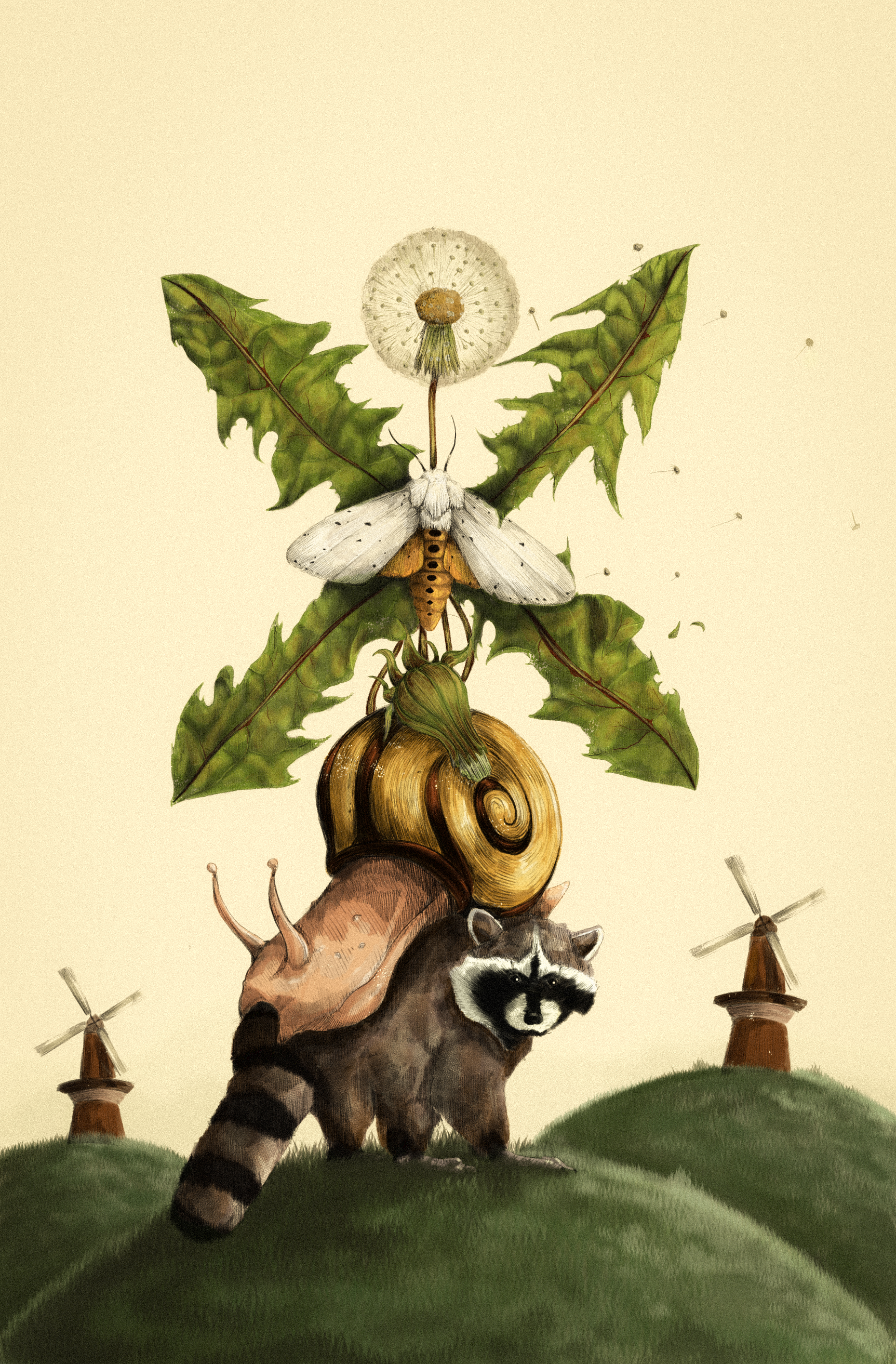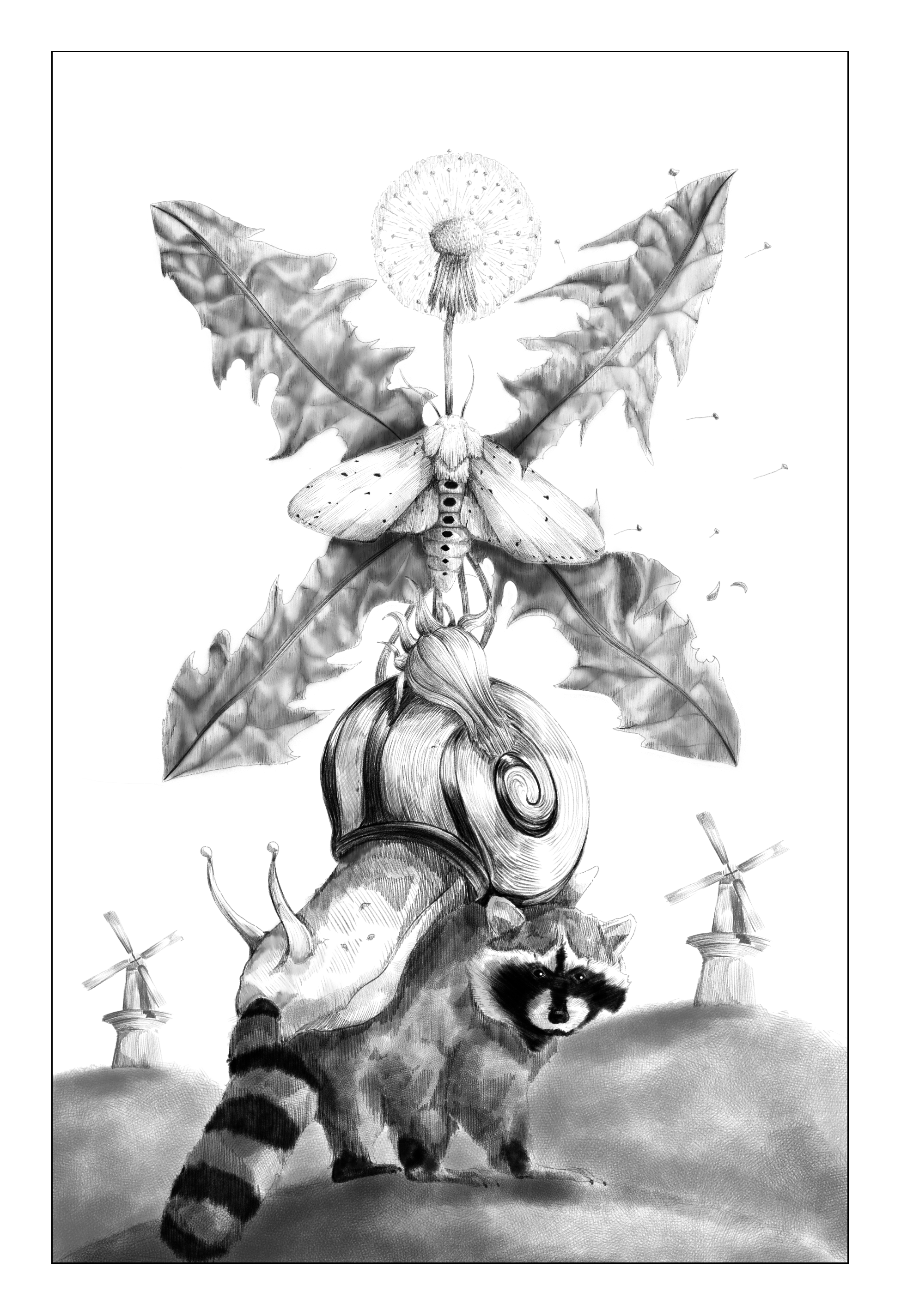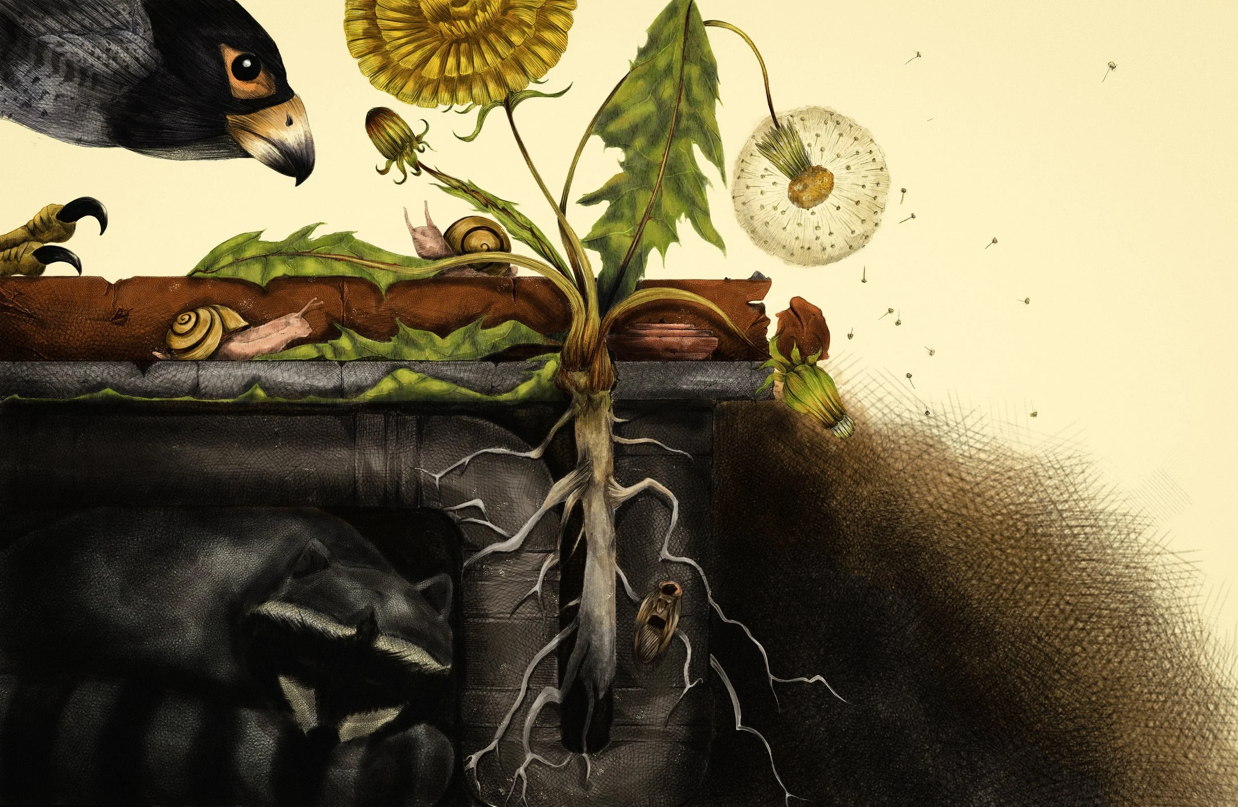 This project was based on the local wildlife in Leiden, Netherlands, and how these animals have adapted to the urban structures and coexist with humans. I developed a full-page spread, a half-page spread, and a spot illustration (see below) I took an approach showing the animals existing alongside human-made structures, morphing into a windmill silhouette, and vignettes into the plant and animal life.
